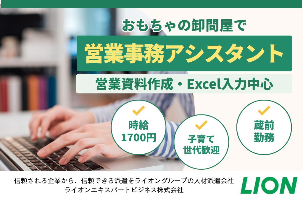 おもちゃの卸会社での営業事務アシスタントのお仕事です。Excelを使用したデータ入力や営業資料作成が中心となり、難しい業務はありません。